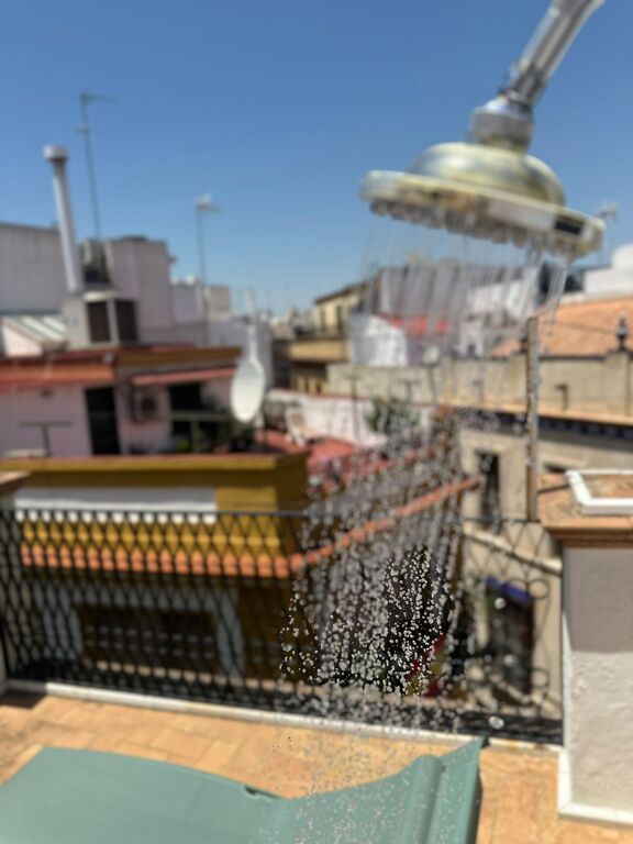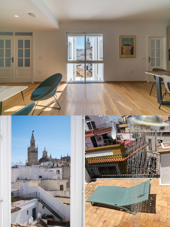 La joya de la corona. Todo es luz. Desde el espectacular salón se puede contemplar el cuadro más bello: la maravillosa vista de la Catedral y la Giralda de Sevilla. El apartamento es un lujo en sí mismo: 3 habitaciones dobles, 2 baños con ducha, salón con sofá cama, cocina moderna totalmente equipada, comedor de diseño. Dispone además de una terraza privada con acceso desde el dormitorio principal, que tiene también vestidor. La terraza solarium, cuenta con hamacas y ducha exterior para tomar el sol. Un privilegio en sí mismo.